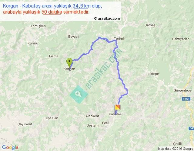 Korgan - Kabataş arası yaklaşık olarak 90 km/h ile yukarıda belirtilen sürede olup, iki yerin kuş uçuşu uzaklığı (mesafesi) 12'dir. Yolculuk otobüsle 1 saat 5 dakika sürmektedir.