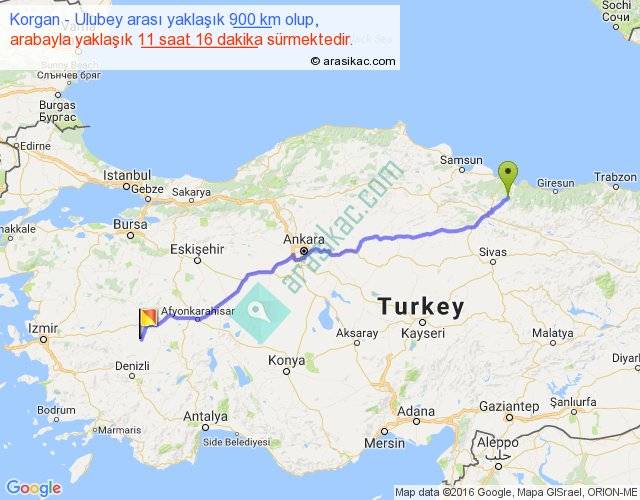 Korgan - Ulubey arası yaklaşık olarak 90 km/h ile yukarıda belirtilen sürede olup, iki yerin kuş uçuşu uzaklığı (mesafesi) 735'dir. Eğer belirtilen yerler arasında uçak seferi var ise bu süre uçakla 1 saat 07 dakika'ya kadar düşebilir. Yolculuk otobüsle 14 saat 38 dakika sürmektedir.