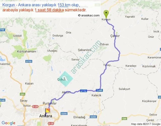 Korgun - Ankara arası yaklaşık olarak 90 km/h ile yukarıda belirtilen sürede olup, iki yerin kuş uçuşu uzaklığı (mesafesi) 105'dir. Yolculuk otobüsle 2 saat 33 dakika sürmektedir.