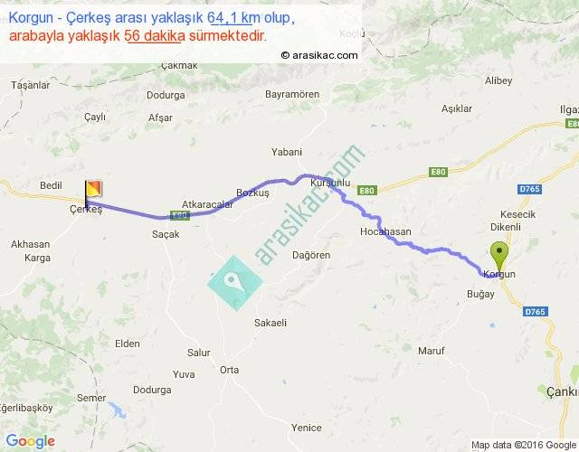 Korgun - Çerkeş arası yaklaşık olarak 90 km/h ile yukarıda belirtilen sürede olup, iki yerin kuş uçuşu uzaklığı (mesafesi) 53'dir. Yolculuk otobüsle 1 saat 12 dakika sürmektedir.