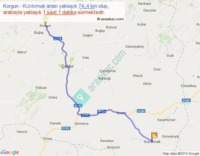 Korgun - Kızılırmak arası yaklaşık olarak 90 km/h ile yukarıda belirtilen sürede olup, iki yerin kuş uçuşu uzaklığı (mesafesi) 58'dir. Yolculuk otobüsle 1 saat 19 dakika sürmektedir.