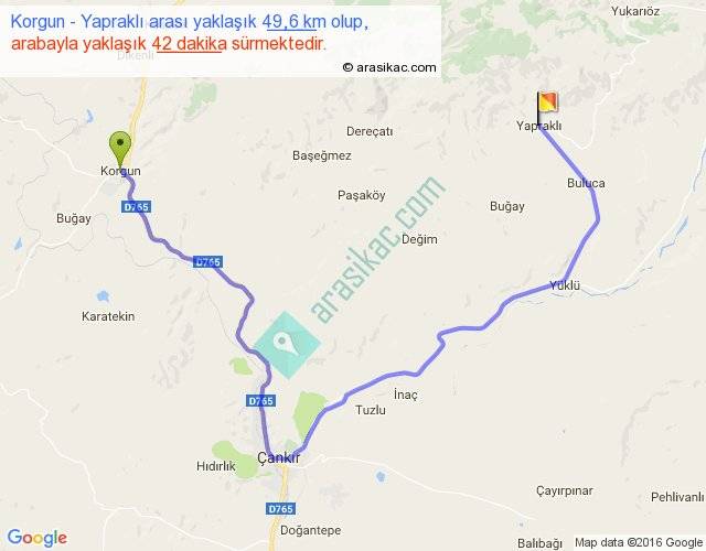 Korgun - Yapraklı arası yaklaşık olarak 90 km/h ile yukarıda belirtilen sürede olup, iki yerin kuş uçuşu uzaklığı (mesafesi) 22'dir. Yolculuk otobüsle 54 dakika sürmektedir.