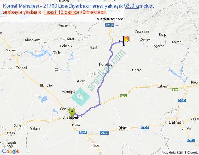 Körhat Mahallesi - 21700 Lice Diyarbakır arası yaklaşık olarak 90 km/h ile yukarıda belirtilen sürede olup, iki yerin kuş uçuşu uzaklığı (mesafesi) 69'dir. Yolculuk otobüsle 1 saat 42 dakika sürmektedir.