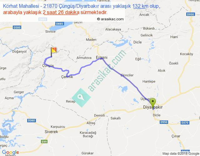 Körhat Mahallesi - 21870 Çüngüş Diyarbakır arası yaklaşık olarak 90 km/h ile yukarıda belirtilen sürede olup, iki yerin kuş uçuşu uzaklığı (mesafesi) 87'dir. Yolculuk otobüsle 3 saat 9 dakika sürmektedir.