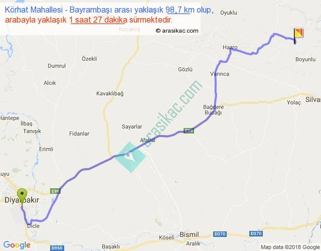 Körhat Mahallesi - Bayrambaşı arası yaklaşık olarak 90 km/h ile yukarıda belirtilen sürede olup, iki yerin kuş uçuşu uzaklığı (mesafesi) 76'dir. Yolculuk otobüsle 1 saat 53 dakika sürmektedir.