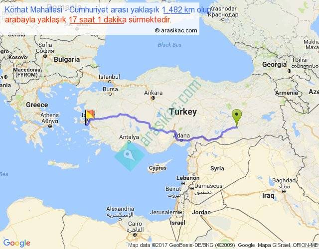 Körhat Mahallesi - Cumhuriyet arası yaklaşık olarak 90 km/h ile yukarıda belirtilen sürede olup, iki yerin kuş uçuşu uzaklığı (mesafesi) 1157'dir. Eğer belirtilen yerler arasında uçak seferi var ise bu süre uçakla 1 saat 46 dakika'ya kadar düşebilir. Yolculuk otobüsle 22 saat 7 dakika sürmektedir.
