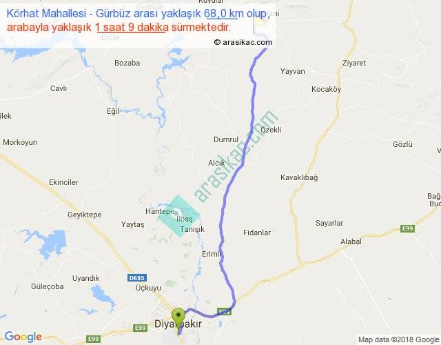 Körhat Mahallesi - Gürbüz arası yaklaşık olarak 90 km/h ile yukarıda belirtilen sürede olup, iki yerin kuş uçuşu uzaklığı (mesafesi) 53'dir. Yolculuk otobüsle 1 saat 29 dakika sürmektedir.