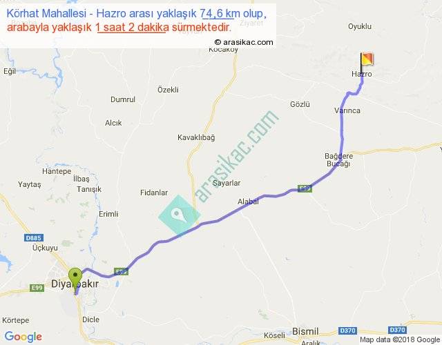 Körhat Mahallesi - Hazro arası yaklaşık olarak 90 km/h ile yukarıda belirtilen sürede olup, iki yerin kuş uçuşu uzaklığı (mesafesi) 62'dir. Yolculuk otobüsle 1 saat 20 dakika sürmektedir.