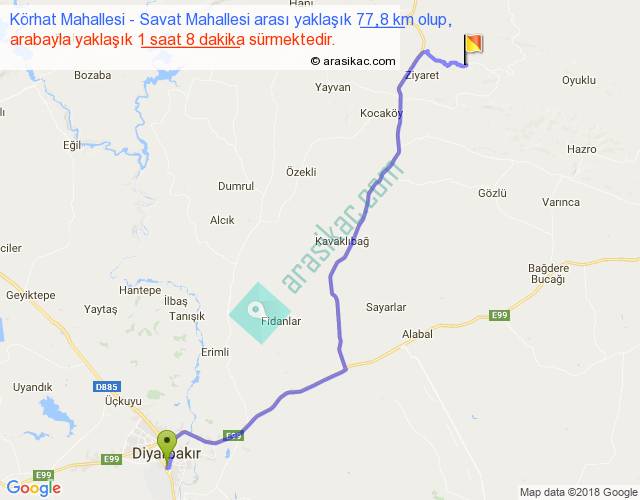 Körhat Mahallesi - Savat Mahallesi arası yaklaşık olarak 90 km/h ile yukarıda belirtilen sürede olup, iki yerin kuş uçuşu uzaklığı (mesafesi) 60'dir. Yolculuk otobüsle 1 saat 28 dakika sürmektedir.
