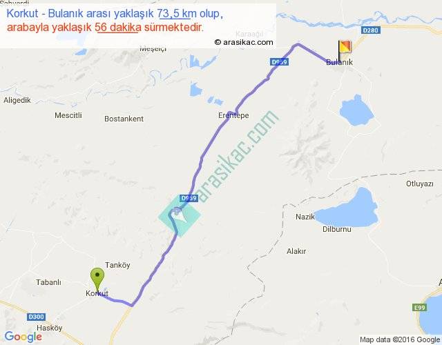Korkut - Bulanık arası yaklaşık olarak 90 km/h ile yukarıda belirtilen sürede olup, iki yerin kuş uçuşu uzaklığı (mesafesi) 57'dir. Yolculuk otobüsle 1 saat 12 dakika sürmektedir.