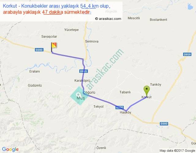 Korkut - Konukbekler arası yaklaşık olarak 90 km/h ile yukarıda belirtilen sürede olup, iki yerin kuş uçuşu uzaklığı (mesafesi) 41'dir. Yolculuk otobüsle 1 saat 1 dakika sürmektedir.