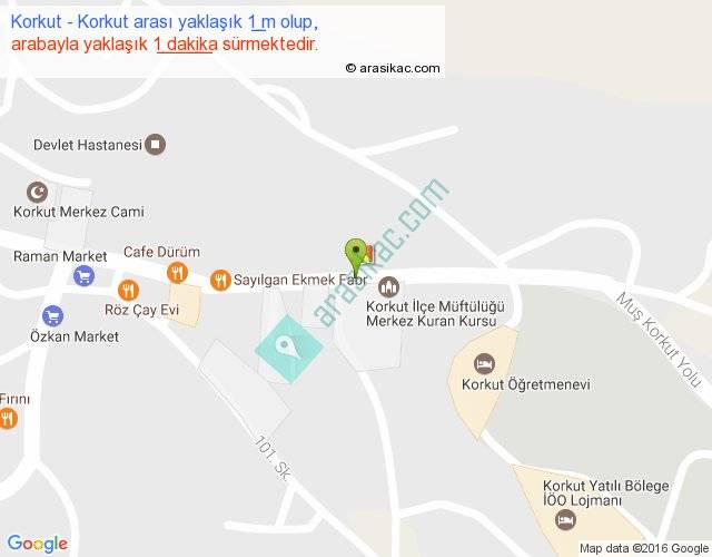 Korkut - Korkut arası yaklaşık olarak 90 km/h ile yukarıda belirtilen sürede olup, iki yerin kuş uçuşu uzaklığı (mesafesi) 0'dir. Yolculuk otobüsle 1 dakika sürmektedir.
