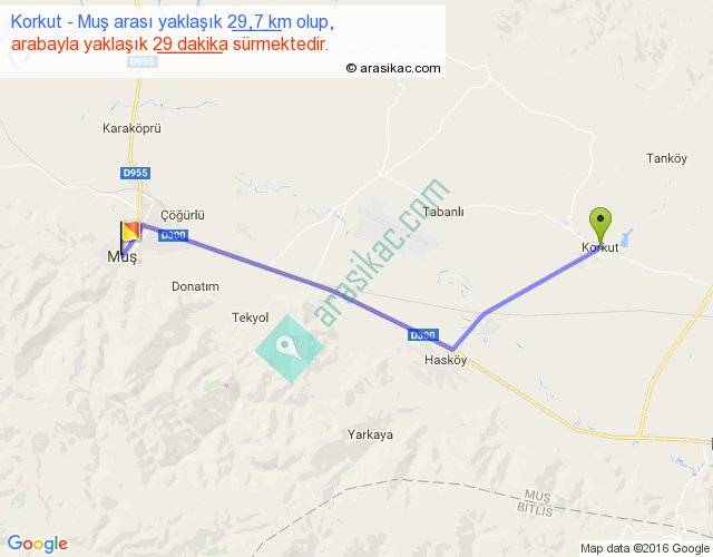 Korkut - Muş arası yaklaşık olarak 90 km/h ile yukarıda belirtilen sürede olup, iki yerin kuş uçuşu uzaklığı (mesafesi) 25'dir. Yolculuk otobüsle 37 dakika sürmektedir.