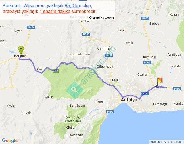 Korkuteli - Aksu arası yaklaşık olarak 90 km/h ile yukarıda belirtilen sürede olup, iki yerin kuş uçuşu uzaklığı (mesafesi) 59'dir. Yolculuk otobüsle 1 saat 28 dakika sürmektedir.
