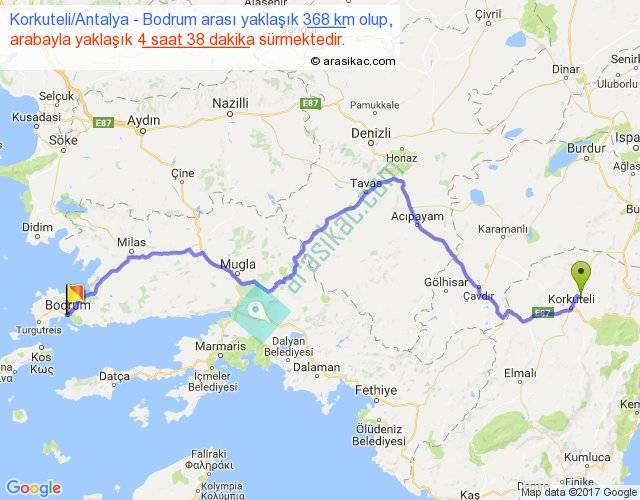 Korkuteli Antalya - Bodrum arası yaklaşık olarak 90 km/h ile yukarıda belirtilen sürede olup, iki yerin kuş uçuşu uzaklığı (mesafesi) 249'dir. Yolculuk otobüsle 6 saat 1 dakika sürmektedir.