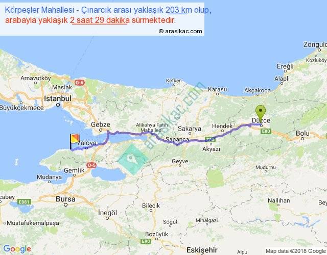 Körpeşler Mahallesi - Çınarcık arası yaklaşık olarak 90 km/h ile yukarıda belirtilen sürede olup, iki yerin kuş uçuşu uzaklığı (mesafesi) 172'dir. Yolculuk otobüsle 3 saat 13 dakika sürmektedir.