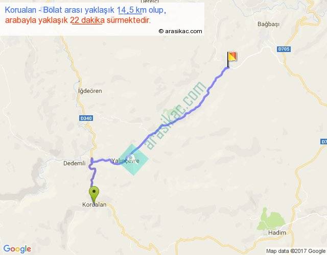 Korualan - Bolat arası yaklaşık olarak 90 km/h ile yukarıda belirtilen sürede olup, iki yerin kuş uçuşu uzaklığı (mesafesi) 11'dir. Yolculuk otobüsle 28 dakika sürmektedir.