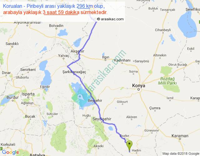 Korualan - Piribeyli arası yaklaşık olarak 90 km/h ile yukarıda belirtilen sürede olup, iki yerin kuş uçuşu uzaklığı (mesafesi) 220'dir. Yolculuk otobüsle 5 saat 10 dakika sürmektedir.