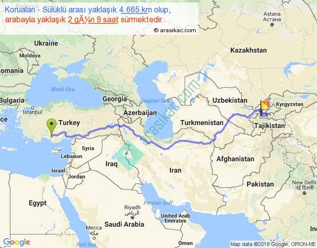 Korualan - Sülüklü arası yaklaşık olarak 90 km/h ile yukarıda belirtilen sürede olup, iki yerin kuş uçuşu uzaklığı (mesafesi) 3216'dir. Eğer belirtilen yerler arasında uçak seferi var ise bu süre uçakla 4 saat 56 dakika'ya kadar düşebilir. Yolculuk otobüsle 3 gün 2 saat sürmektedir.