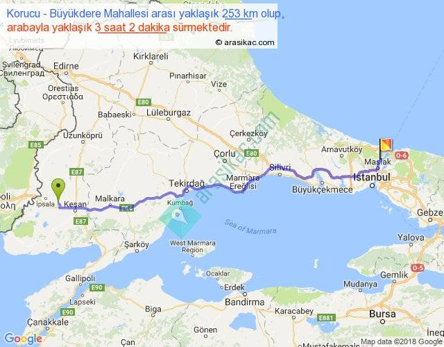Korucu - Büyükdere Mahallesi arası yaklaşık olarak 90 km/h ile yukarıda belirtilen sürede olup, iki yerin kuş uçuşu uzaklığı (mesafesi) 215'dir. Yolculuk otobüsle 3 saat 56 dakika sürmektedir.