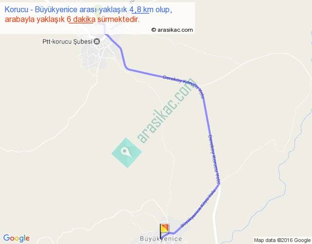 Korucu - Büyükyenice arası yaklaşık olarak 90 km/h ile yukarıda belirtilen sürede olup, iki yerin kuş uçuşu uzaklığı (mesafesi) 3'dir. Yolculuk otobüsle 7 dakika sürmektedir.