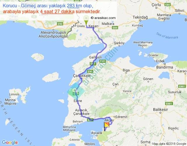 Korucu - Gömeç arası yaklaşık olarak 90 km/h ile yukarıda belirtilen sürede olup, iki yerin kuş uçuşu uzaklığı (mesafesi) 169'dir. Yolculuk otobüsle 5 saat 47 dakika sürmektedir.