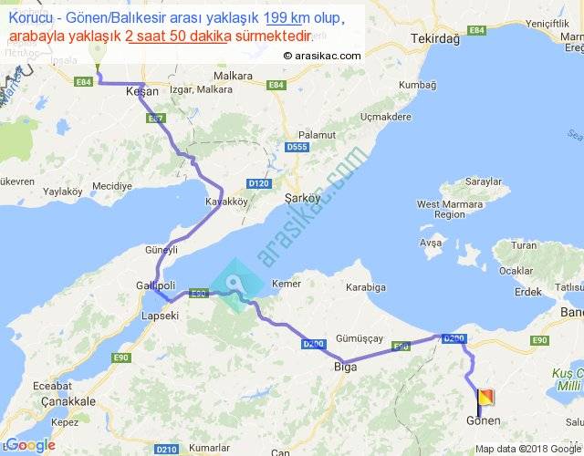 Korucu - Gönen Balıkesir arası yaklaşık olarak 90 km/h ile yukarıda belirtilen sürede olup, iki yerin kuş uçuşu uzaklığı (mesafesi) 130'dir. Yolculuk otobüsle 3 saat 41 dakika sürmektedir.