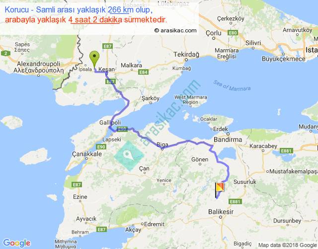 Korucu - Samli arası yaklaşık olarak 90 km/h ile yukarıda belirtilen sürede olup, iki yerin kuş uçuşu uzaklığı (mesafesi) 165'dir. Yolculuk otobüsle 5 saat 14 dakika sürmektedir.
