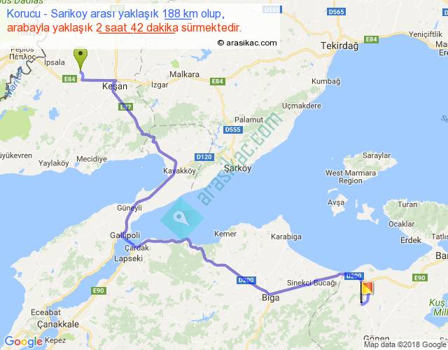 Korucu - Sarikoy arası yaklaşık olarak 90 km/h ile yukarıda belirtilen sürede olup, iki yerin kuş uçuşu uzaklığı (mesafesi) 120'dir. Yolculuk otobüsle 3 saat 30 dakika sürmektedir.