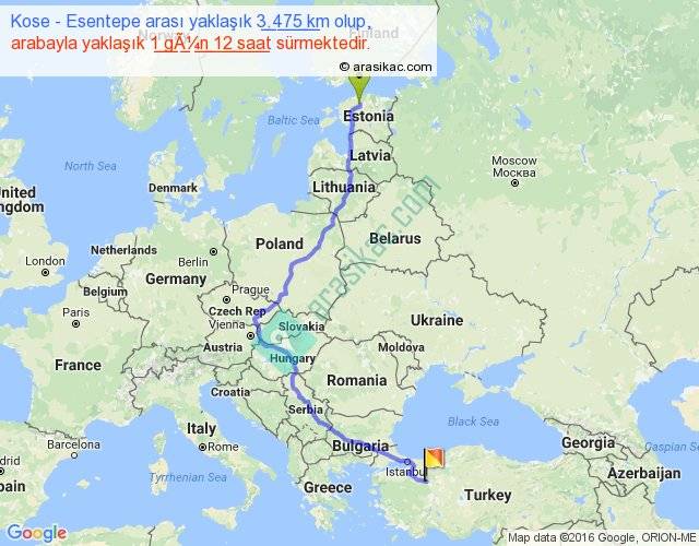 Kose - Esentepe arası yaklaşık olarak 90 km/h ile yukarıda belirtilen sürede olup, iki yerin kuş uçuşu uzaklığı (mesafesi) 2175'dir. Eğer belirtilen yerler arasında uçak seferi var ise bu süre uçakla 3 saat 20 dakika'ya kadar düşebilir. Yolculuk otobüsle 1 gün 22 saat sürmektedir.