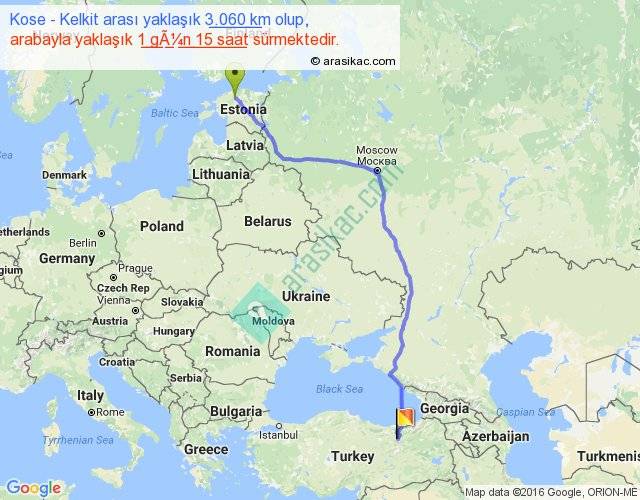 Kose - Kelkit arası yaklaşık olarak 90 km/h ile yukarıda belirtilen sürede olup, iki yerin kuş uçuşu uzaklığı (mesafesi) 2329'dir. Eğer belirtilen yerler arasında uçak seferi var ise bu süre uçakla 3 saat 34 dakika'ya kadar düşebilir. Yolculuk otobüsle 2 gün 2 saat sürmektedir.