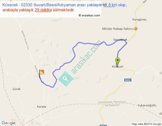 Köseceli - 02330 Suvarlı Besni Adıyaman arası yaklaşık olarak 90 km/h ile yukarıda belirtilen sürede olup, iki yerin kuş uçuşu uzaklığı (mesafesi) 9'dir. Yolculuk otobüsle 37 dakika sürmektedir.
