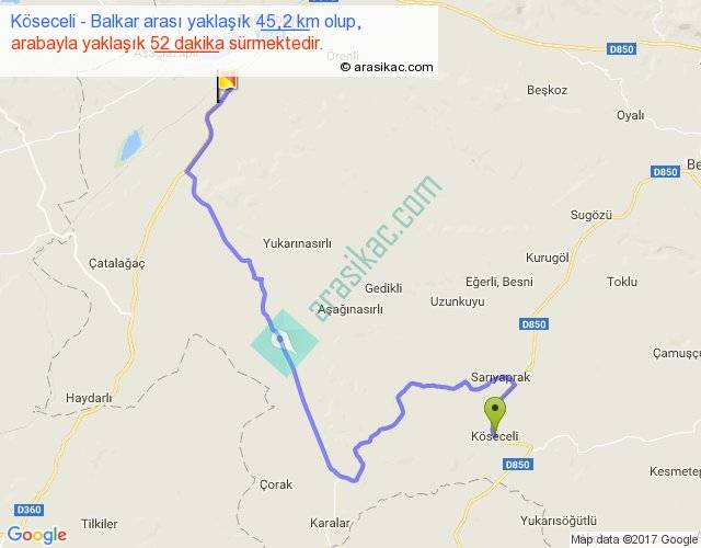 Köseceli - Balkar arası yaklaşık olarak 90 km/h ile yukarıda belirtilen sürede olup, iki yerin kuş uçuşu uzaklığı (mesafesi) 24'dir. Yolculuk otobüsle 1 saat 7 dakika sürmektedir.
