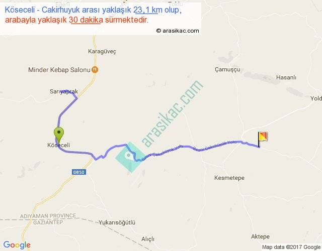 Köseceli - Cakirhuyuk arası yaklaşık olarak 90 km/h ile yukarıda belirtilen sürede olup, iki yerin kuş uçuşu uzaklığı (mesafesi) 12'dir. Yolculuk otobüsle 39 dakika sürmektedir.