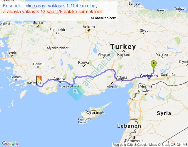 Köseceli - İnlice arası yaklaşık olarak 90 km/h ile yukarıda belirtilen sürede olup, iki yerin kuş uçuşu uzaklığı (mesafesi) 775'dir. Eğer belirtilen yerler arasında uçak seferi var ise bu süre uçakla 1 saat 11 dakika'ya kadar düşebilir. Yolculuk otobüsle 17 saat 31 dakika sürmektedir.