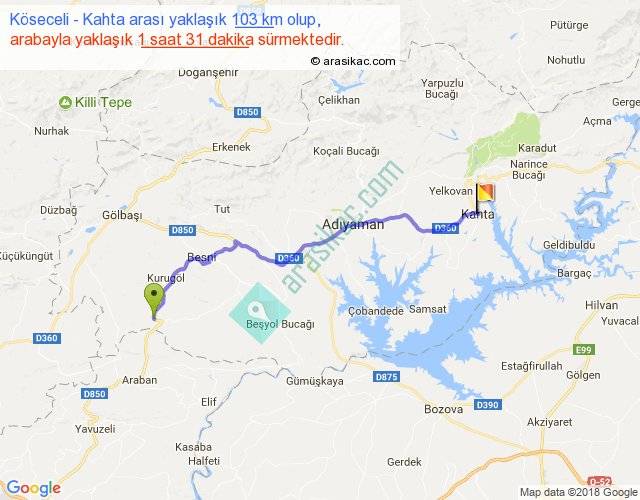 Köseceli - Kahta arası yaklaşık olarak 90 km/h ile yukarıda belirtilen sürede olup, iki yerin kuş uçuşu uzaklığı (mesafesi) 82'dir. Yolculuk otobüsle 1 saat 58 dakika sürmektedir.