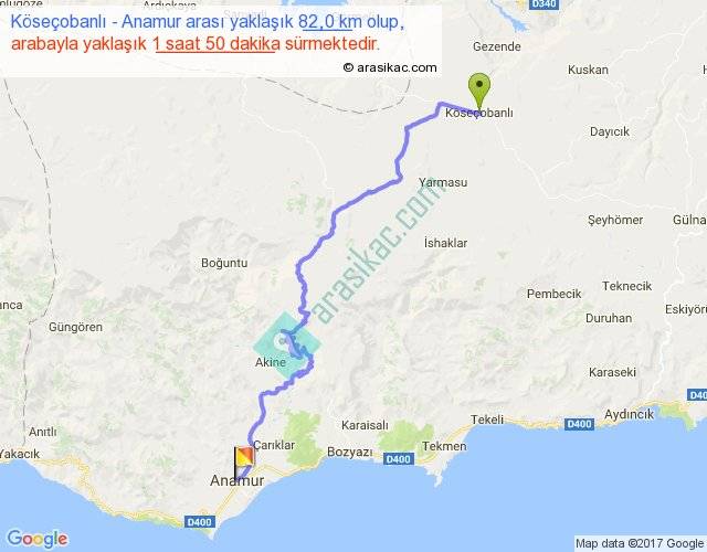 Köseçobanlı - Anamur arası yaklaşık olarak 90 km/h ile yukarıda belirtilen sürede olup, iki yerin kuş uçuşu uzaklığı (mesafesi) 49'dir. Yolculuk otobüsle 2 saat 23 dakika sürmektedir.