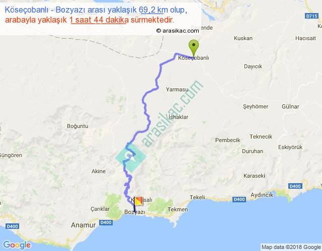 Köseçobanlı - Bozyazı arası yaklaşık olarak 90 km/h ile yukarıda belirtilen sürede olup, iki yerin kuş uçuşu uzaklığı (mesafesi) 40'dir. Yolculuk otobüsle 2 saat 15 dakika sürmektedir.