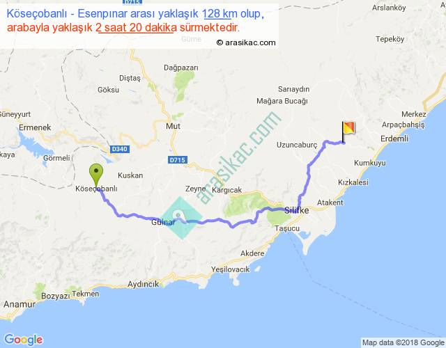 Köseçobanlı - Esenpınar arası yaklaşık olarak 90 km/h ile yukarıda belirtilen sürede olup, iki yerin kuş uçuşu uzaklığı (mesafesi) 88'dir. Yolculuk otobüsle 3 saat 2 dakika sürmektedir.