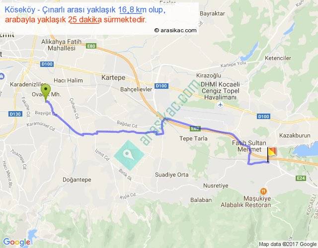 Köseköy - Çınarlı arası yaklaşık olarak 90 km/h ile yukarıda belirtilen sürede olup, iki yerin kuş uçuşu uzaklığı (mesafesi) 13'dir. Yolculuk otobüsle 32 dakika sürmektedir.