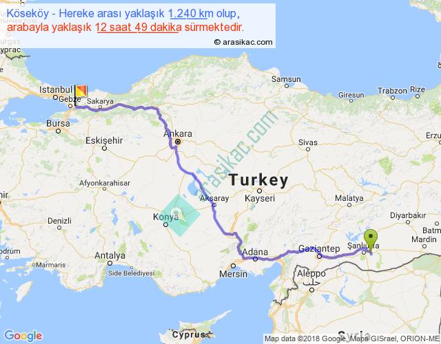 Köseköy - Hereke arası yaklaşık olarak 90 km/h ile yukarıda belirtilen sürede olup, iki yerin kuş uçuşu uzaklığı (mesafesi) 903'dir. Eğer belirtilen yerler arasında uçak seferi var ise bu süre uçakla 1 saat 23 dakika'ya kadar düşebilir. Yolculuk otobüsle 16 saat 39 dakika sürmektedir.