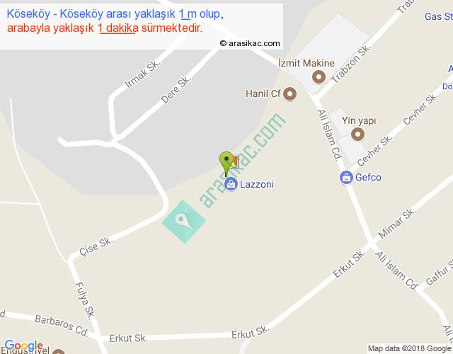 Köseköy - Köseköy arası yaklaşık olarak 90 km/h ile yukarıda belirtilen sürede olup, iki yerin kuş uçuşu uzaklığı (mesafesi) 0'dir. Yolculuk otobüsle 1 dakika sürmektedir.