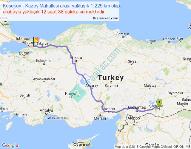 Köseköy - Kuzey Mahallesi arası yaklaşık olarak 90 km/h ile yukarıda belirtilen sürede olup, iki yerin kuş uçuşu uzaklığı (mesafesi) 890'dir. Eğer belirtilen yerler arasında uçak seferi var ise bu süre uçakla 1 saat 22 dakika'ya kadar düşebilir. Yolculuk otobüsle 16 saat 25 dakika sürmektedir.