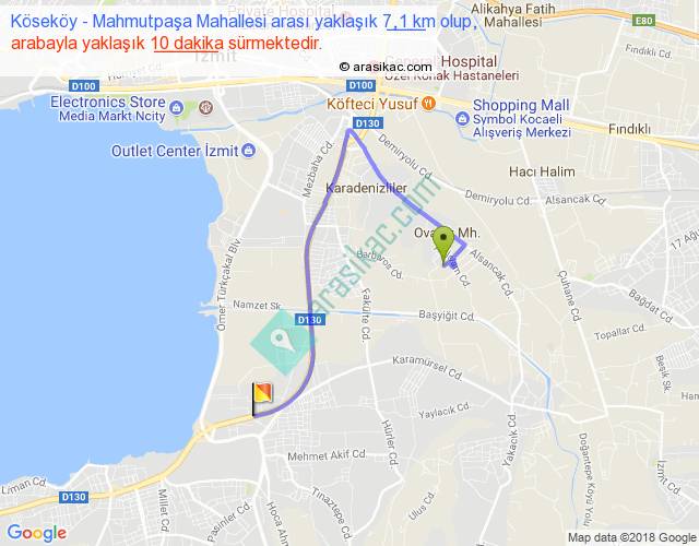 Köseköy - Mahmutpaşa Mahallesi arası yaklaşık olarak 90 km/h ile yukarıda belirtilen sürede olup, iki yerin kuş uçuşu uzaklığı (mesafesi) 3'dir. Yolculuk otobüsle 13 dakika sürmektedir.