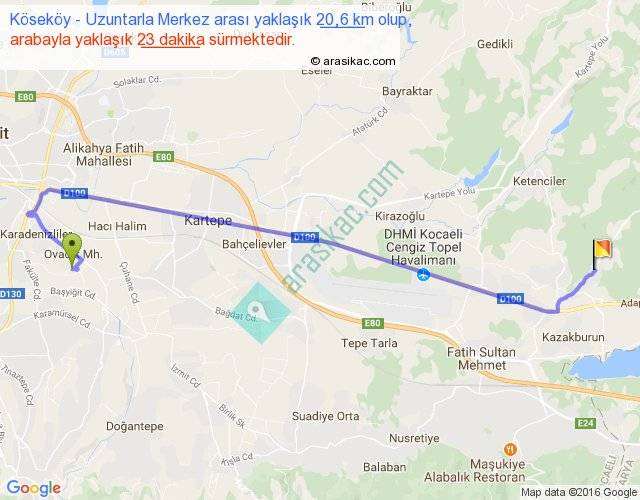 Köseköy - Uzuntarla Merkez arası yaklaşık olarak 90 km/h ile yukarıda belirtilen sürede olup, iki yerin kuş uçuşu uzaklığı (mesafesi) 15'dir. Yolculuk otobüsle 29 dakika sürmektedir.