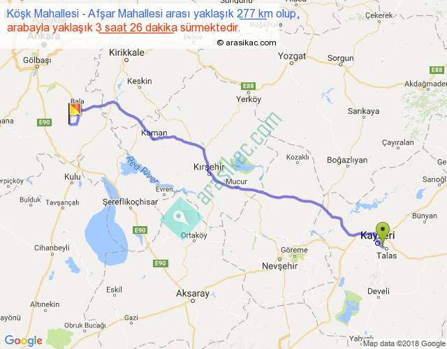 Köşk Mahallesi - Afşar Mahallesi arası yaklaşık olarak 90 km/h ile yukarıda belirtilen sürede olup, iki yerin kuş uçuşu uzaklığı (mesafesi) 227'dir. Yolculuk otobüsle 4 saat 27 dakika sürmektedir.