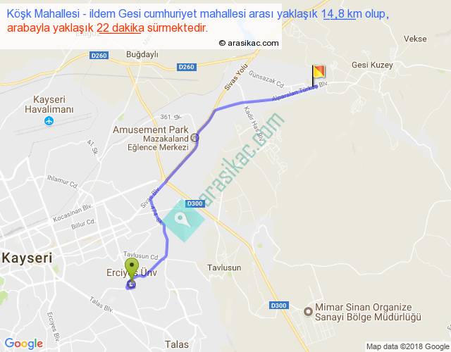 Köşk Mahallesi - ildem Gesi cumhuriyet mahallesi arası yaklaşık olarak 90 km/h ile yukarıda belirtilen sürede olup, iki yerin kuş uçuşu uzaklığı (mesafesi) 11'dir. Yolculuk otobüsle 28 dakika sürmektedir.