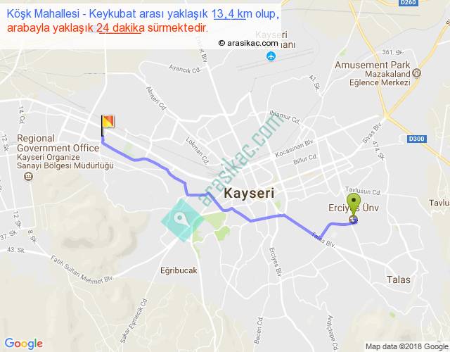 Köşk Mahallesi - Keykubat arası yaklaşık olarak 90 km/h ile yukarıda belirtilen sürede olup, iki yerin kuş uçuşu uzaklığı (mesafesi) 11'dir. Yolculuk otobüsle 31 dakika sürmektedir.