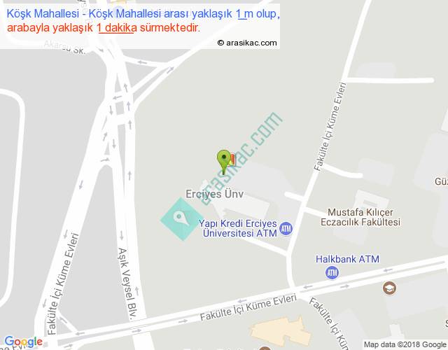 Köşk Mahallesi - Köşk Mahallesi arası yaklaşık olarak 90 km/h ile yukarıda belirtilen sürede olup, iki yerin kuş uçuşu uzaklığı (mesafesi) 0'dir. Yolculuk otobüsle 1 dakika sürmektedir.