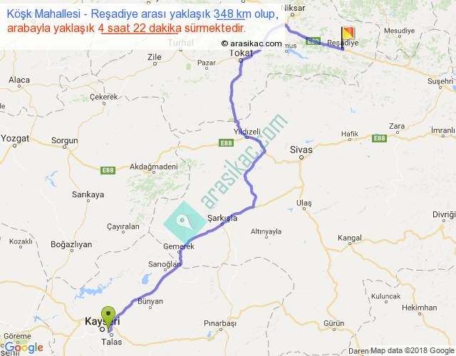 Köşk Mahallesi - Reşadiye arası yaklaşık olarak 90 km/h ile yukarıda belirtilen sürede olup, iki yerin kuş uçuşu uzaklığı (mesafesi) 241'dir. Yolculuk otobüsle 5 saat 40 dakika sürmektedir.